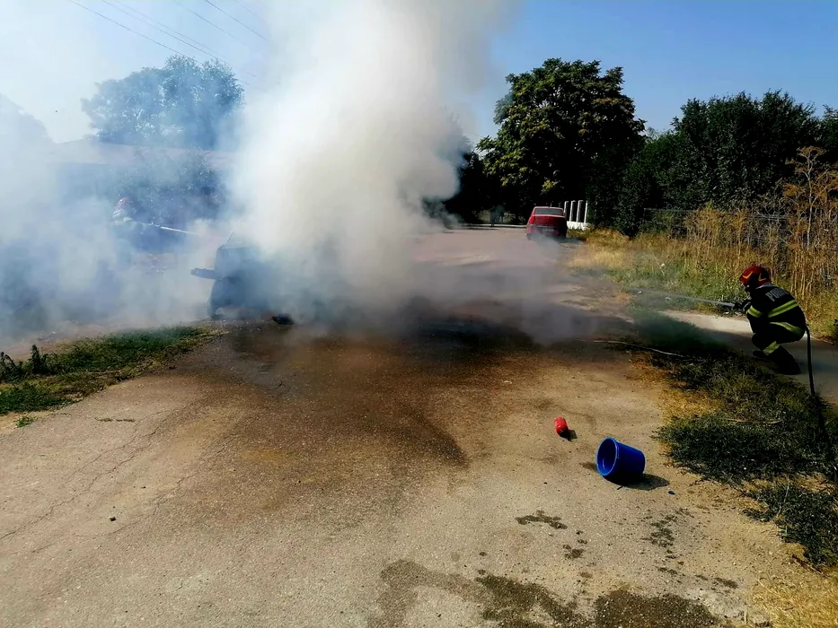 FOTO-VIDEO | Un autoturism a luat foc pe un drum din județul Giurgiu. La volan se afla o femeie