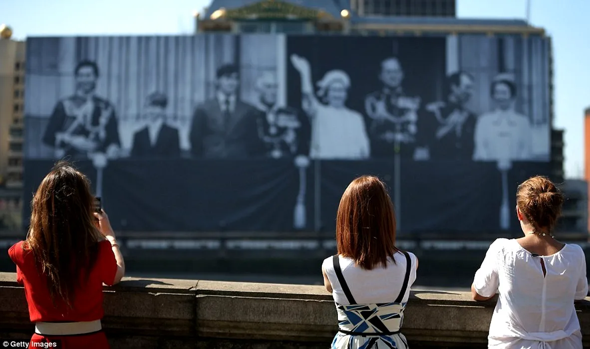 Un banner uriaș cu imaginea Familiei Regale britanice, desfășurat pe cheiul Tamisei