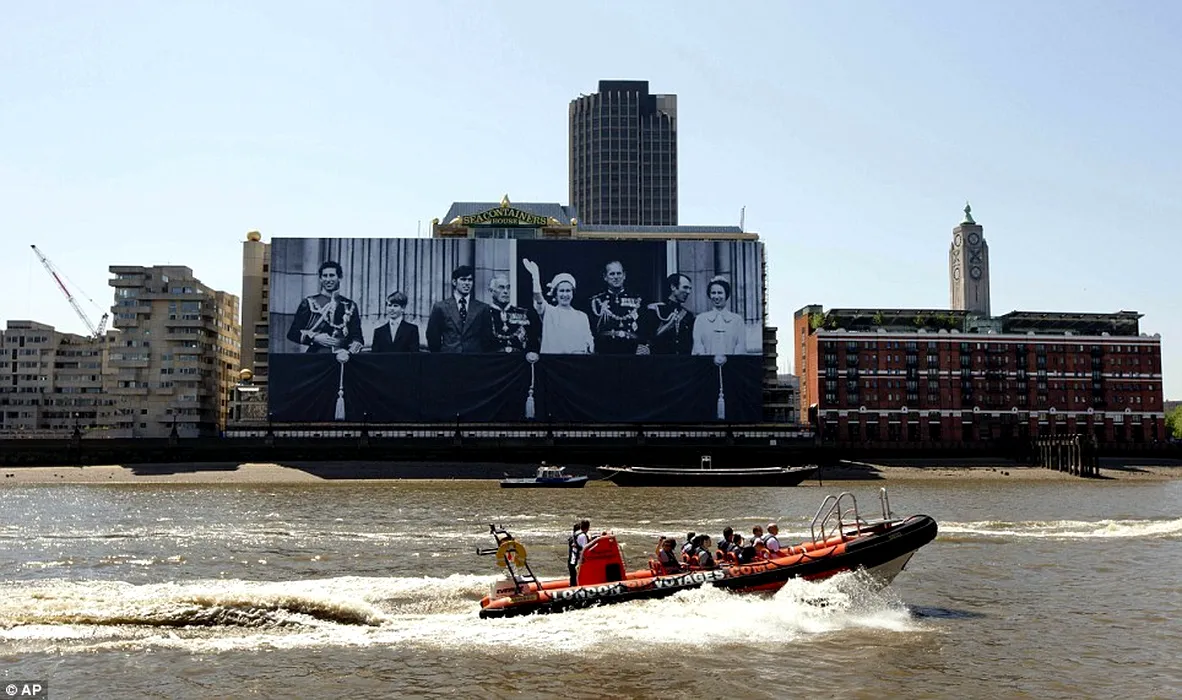 Un banner uriaș cu imaginea Familiei Regale britanice, desfășurat pe cheiul Tamisei