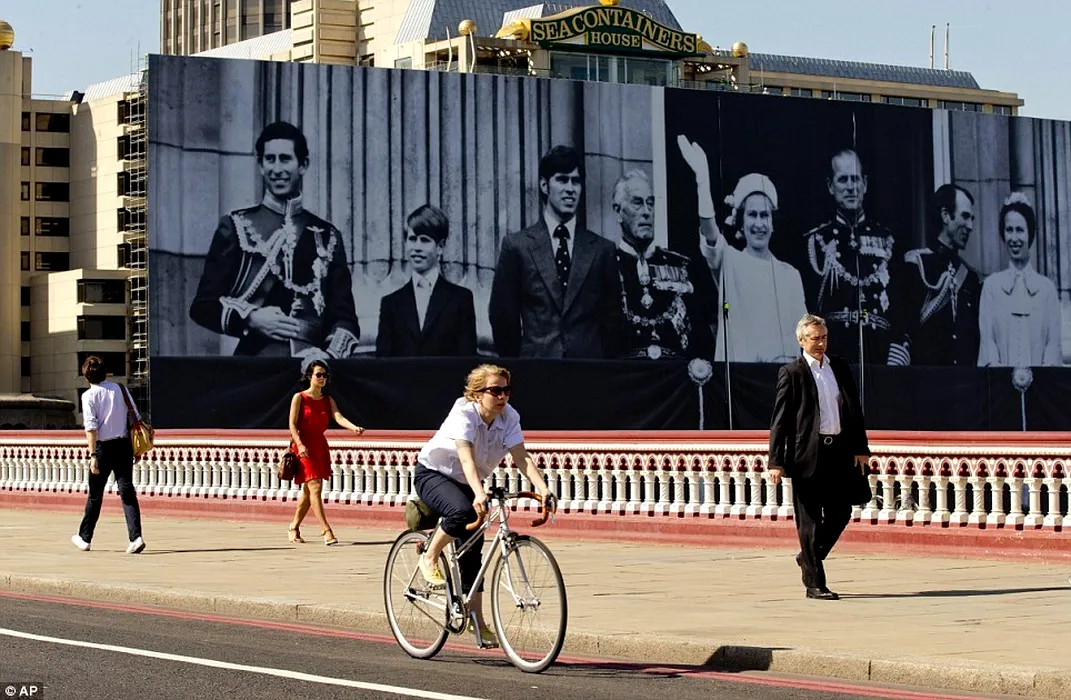 Un banner uriaș cu imaginea Familiei Regale britanice, desfășurat pe cheiul Tamisei