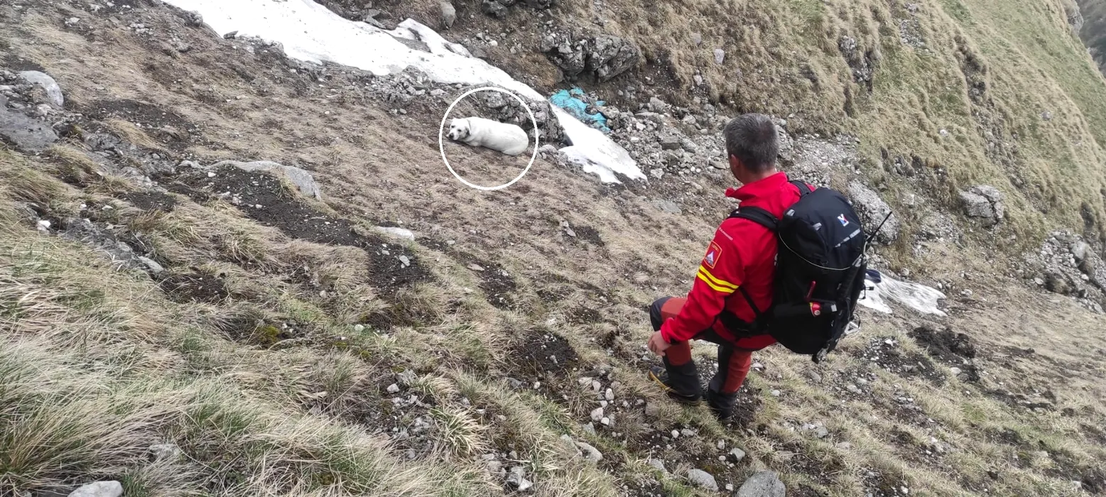 Un câine a CĂZUT aproape 200 de metri într-o prăpastie din Bucegi. Salvamontiștii din Bușteni: „Niciun om nu a scăpat cu viață de acolo”