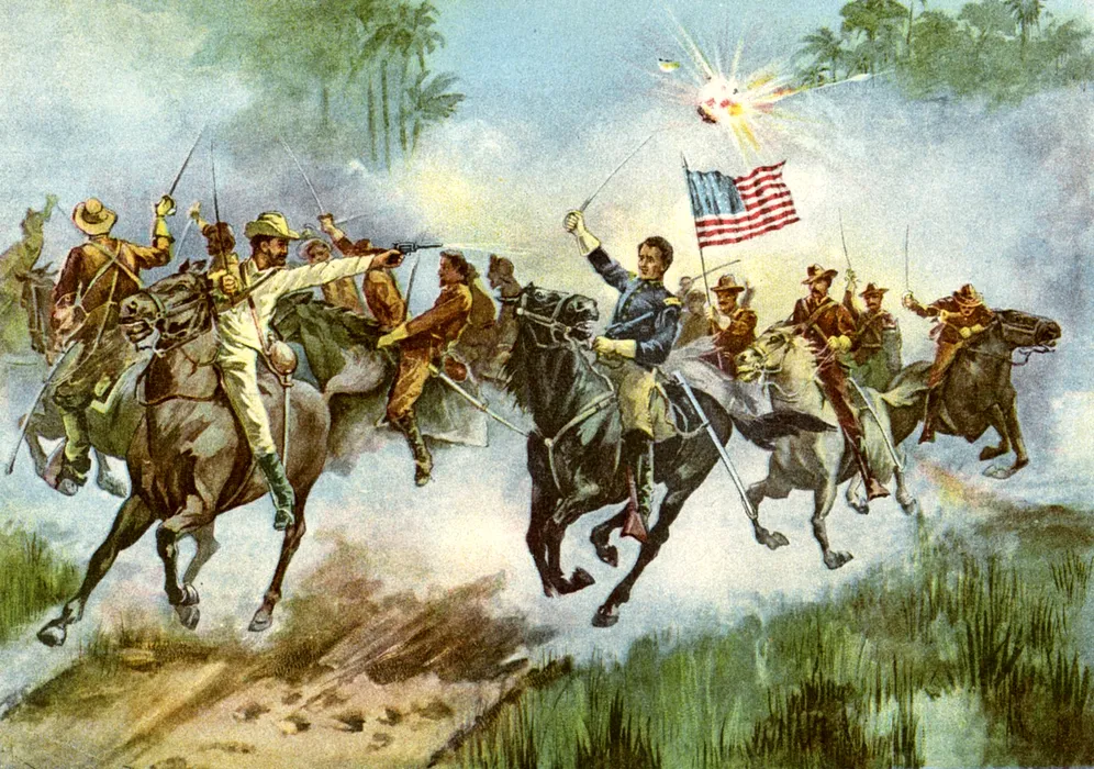 Rough Riders stampeding a Spanish outpost, Cuba, Spanish-American War, 1898. The 'Rough Riders' was the name given to the 1st United States Volunteer Cavalry, a regiment raised specifically to fight in the Spanish-American War. The unit distiguished itself in the fighting on Cuba, notably at the Battle of San Juan Hill where it was commanded by future US President Theodore Roosevelt. A print from Our Country in War and Relations with All Nations, by Murat Halstead, The United Subscription Book Publishers of America, 1898.,Image: 264981241, License: Rights-managed, Restrictions: , Model Release: no