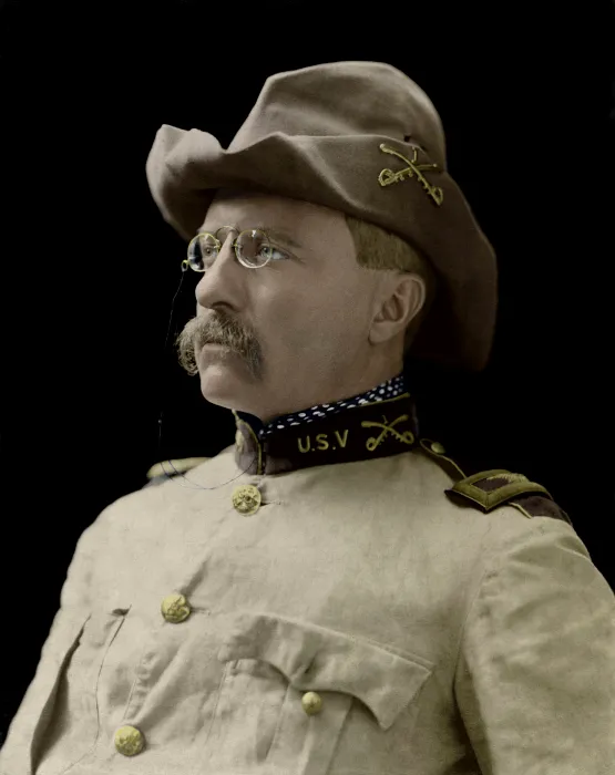 Colonel Theodore Roosevelt in the uniform of 1st United States Volunteer Cavalry, Oct. 26, 1898, which he raised to fight in the Spanish American War, 1898-1898. He wears a slouch hat and blue and white handkerchief knotted around his neck. Digital color by Barbara Cushing Schultz, 2020 (BSIC_2020_10_42),Image: 635351910, License: Rights-managed, Restrictions: For usage credit please use;, Model Release: no