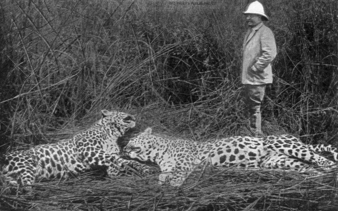 President Theodore Roosevelt (1858-1919), standing beside two dead cheetahs, original title: ''President Theodore Roosevelt in Africa: Kermit Roosevelt''s narrow escape'', President of the United States: 1901-1909, photograph 1910.,Image: 97035785, License: Rights-managed, Restrictions: For usage credit please use; Courtesy Everett Collection, Model Release: no