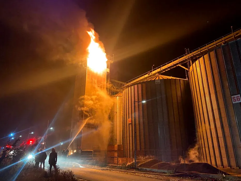 Un incendiu puternic a cuprins un depozit de cereale din Bacău. Zeci de tone de floarea soarelui au fost distruse de flăcări