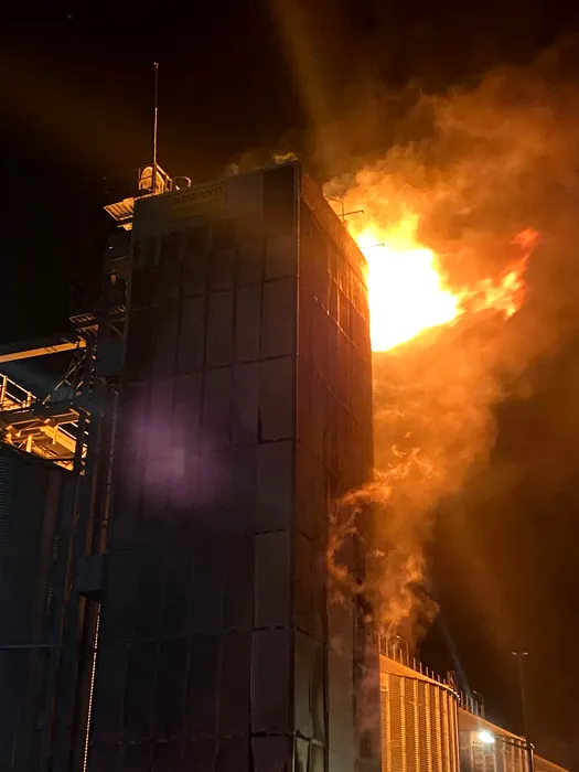 Un incendiu puternic a cuprins un depozit de cereale din Bacău. Zeci de tone de floarea soarelui au fost distruse de flăcări