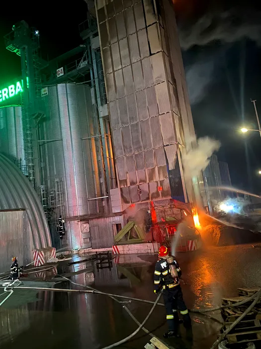Un incendiu puternic a cuprins un depozit de cereale din Bacău. Zeci de tone de floarea soarelui au fost distruse de flăcări