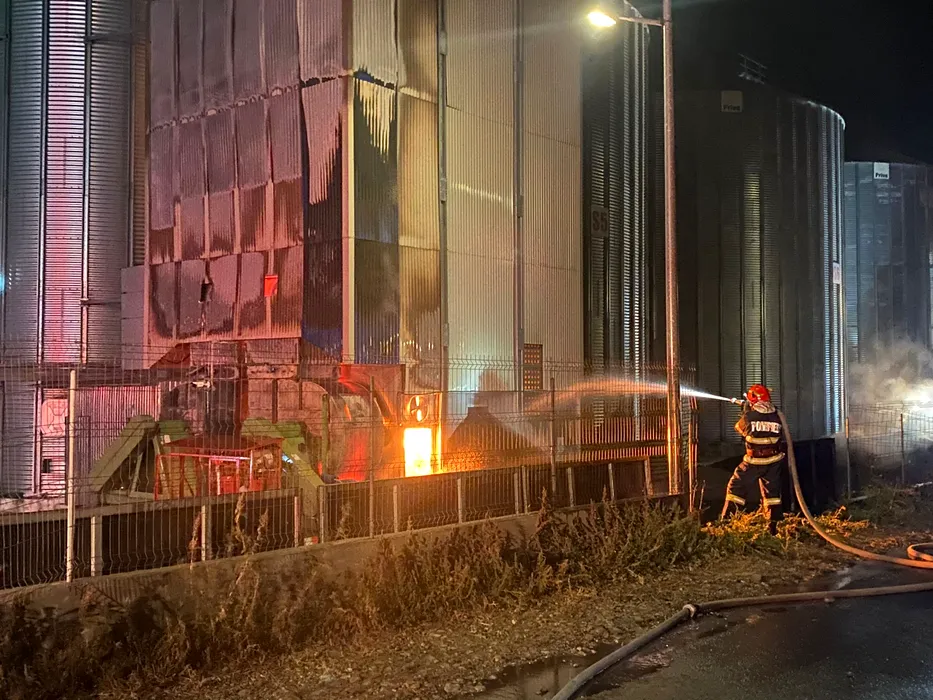 Un incendiu puternic a cuprins un depozit de cereale din Bacău. Zeci de tone de floarea soarelui au fost distruse de flăcări
