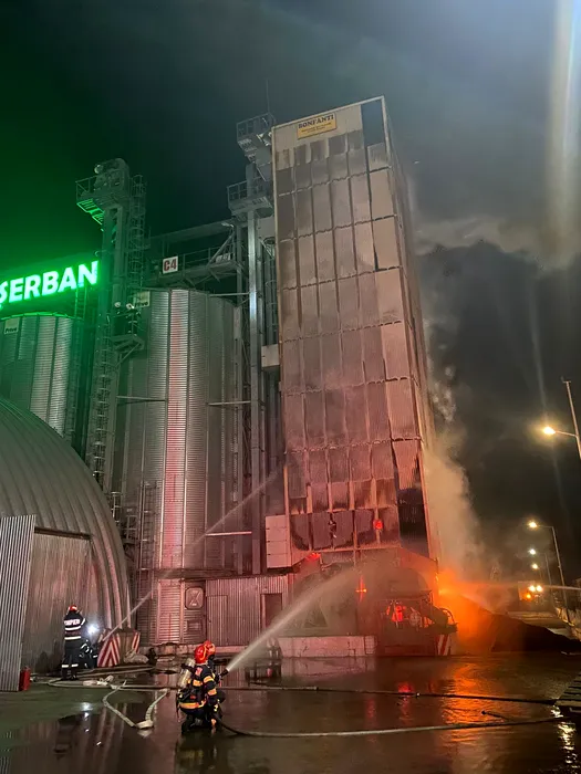 Un incendiu puternic a cuprins un depozit de cereale din Bacău. Zeci de tone de floarea soarelui au fost distruse de flăcări