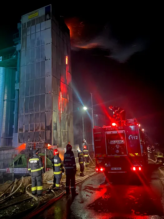 Un incendiu puternic a cuprins un depozit de cereale din Bacău. Zeci de tone de floarea soarelui au fost distruse de flăcări