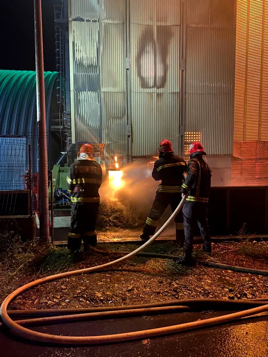 Un incendiu puternic a cuprins un depozit de cereale din Bacău. Zeci de tone de floarea soarelui au fost distruse de flăcări