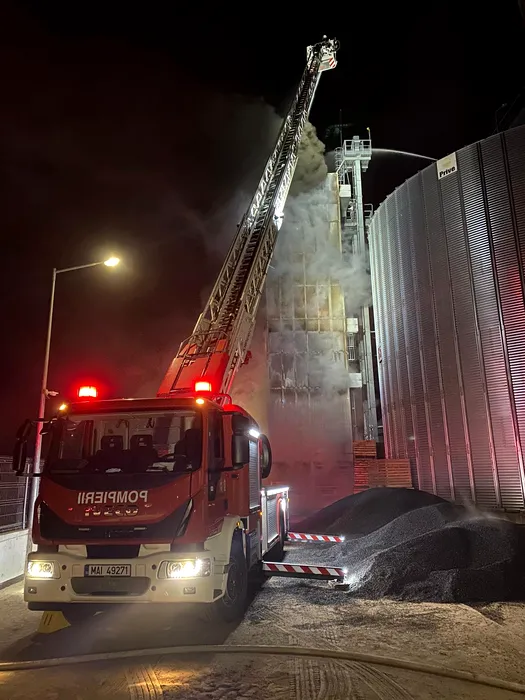 Un incendiu puternic a cuprins un depozit de cereale din Bacău. Zeci de tone de floarea soarelui au fost distruse de flăcări