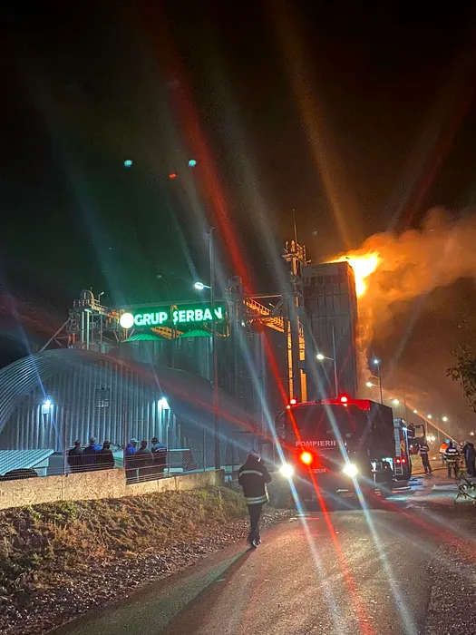Un incendiu puternic a cuprins un depozit de cereale din Bacău. Zeci de tone de floarea soarelui au fost distruse de flăcări