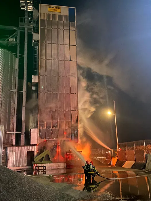 Un incendiu puternic a cuprins un depozit de cereale din Bacău. Zeci de tone de floarea soarelui au fost distruse de flăcări