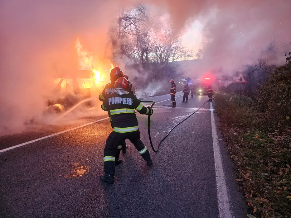 Un microbuz care transporta 11 muncitori A LUAT FOC, la ieșirea din Iași. Pompierii au intervenit de urgență