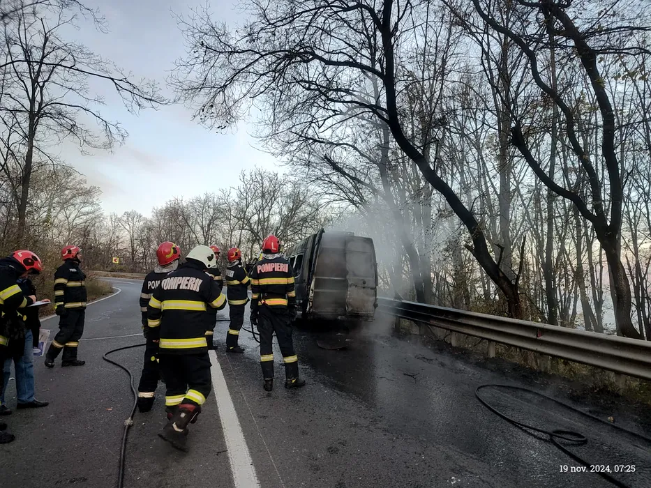 Un microbuz care transporta 11 muncitori A LUAT FOC, la ieșirea din Iași. Pompierii au intervenit de urgență