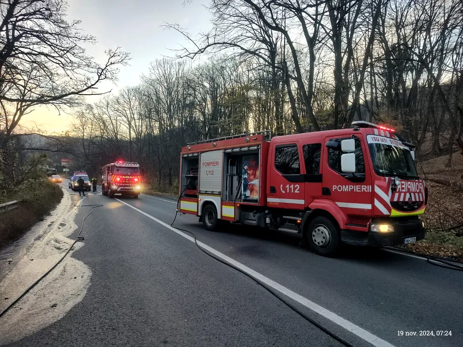 Un microbuz care transporta 11 muncitori A LUAT FOC, la ieșirea din Iași. Pompierii au intervenit de urgență