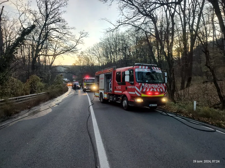 Un microbuz care transporta 11 muncitori A LUAT FOC, la ieșirea din Iași. Pompierii au intervenit de urgență