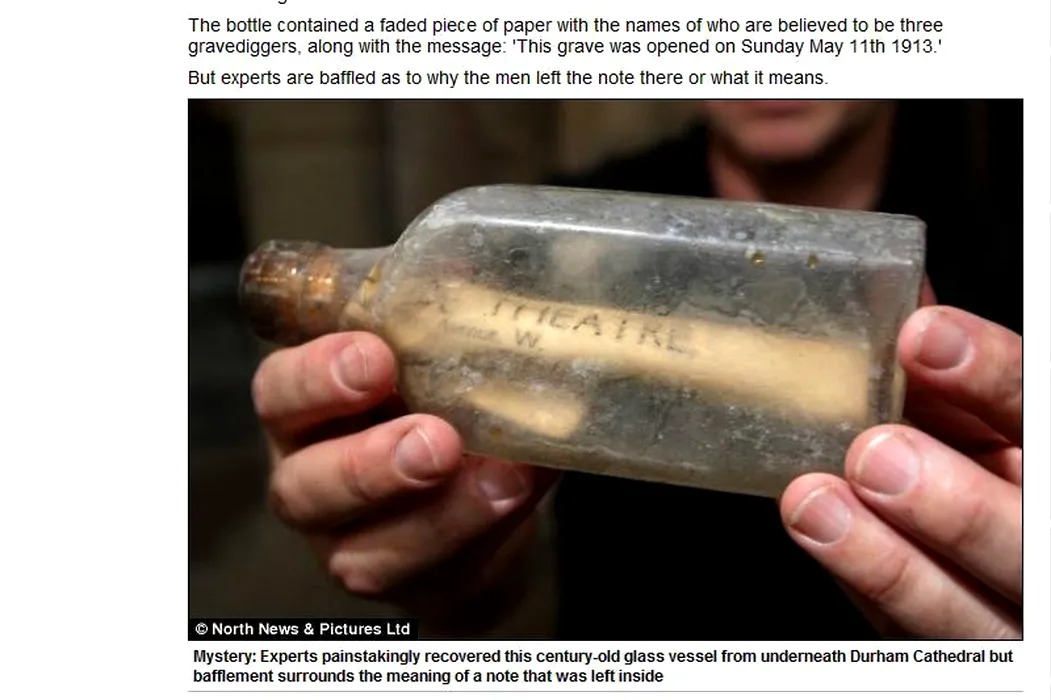 Un pietrar din Marea Britanie, care lucra într-o catedrală, a descoperit o sticlă veche de un secol. Mesajul din interior i-a uimit pe arheologi