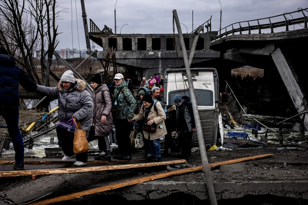 FOTO | Un pod distrus de rachetele armatei ruse a rămas singura cale de evacuare a localnicilor din Irpin, un oraș de lângă Kiev