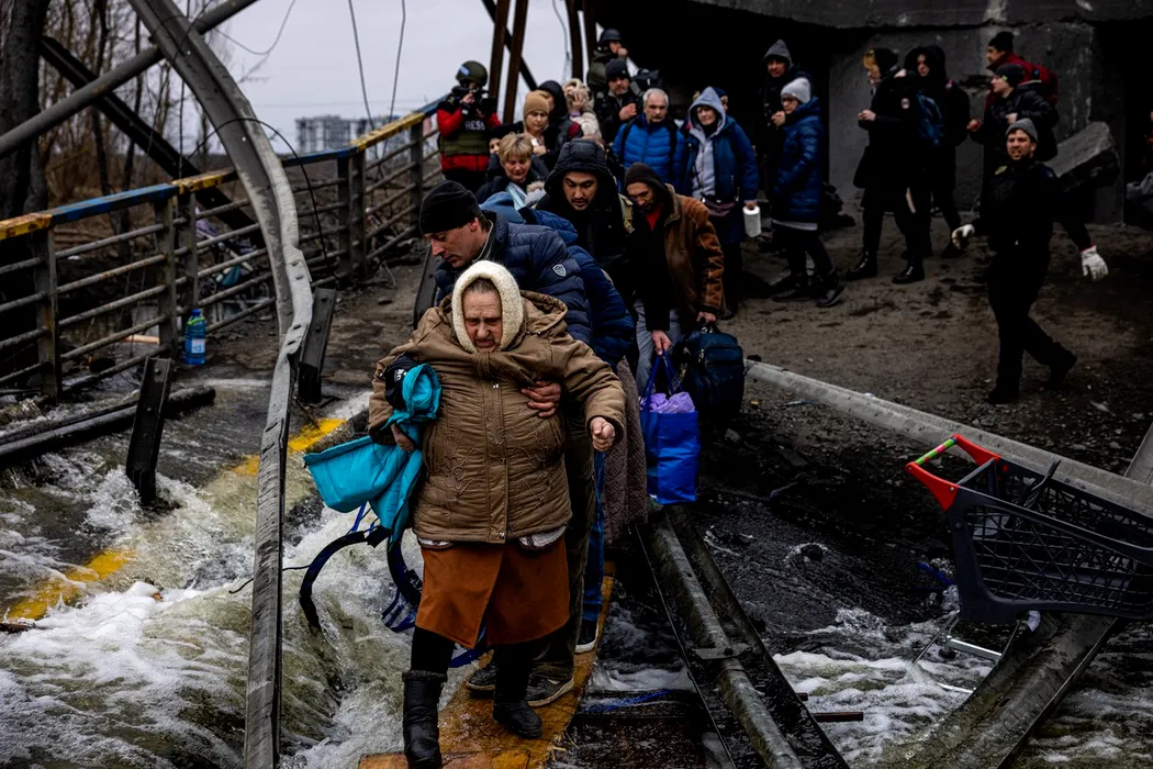 GALERIE FOTO: FOTO | Un pod distrus de rachetele armatei ruse a rămas singura cale de evacuare a localnicilor din Irpin, un oraș de lângă Kiev