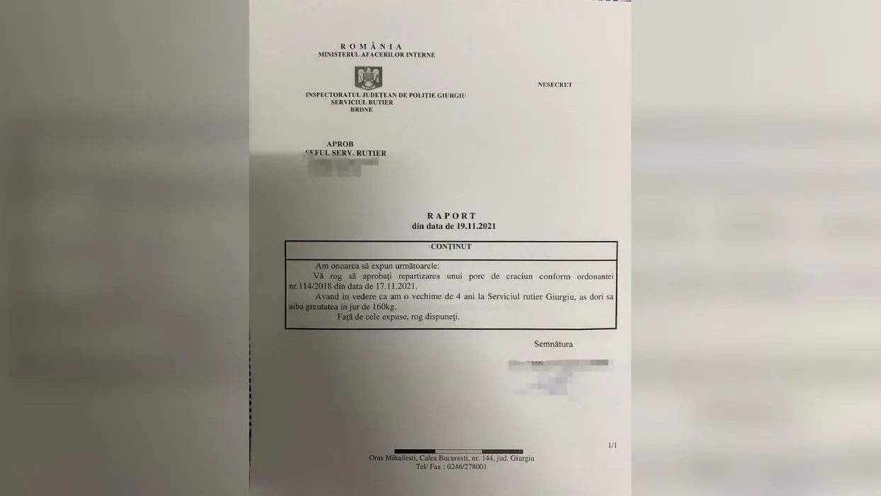 Un polițist din Giurgiu a întocmit un raport pentru a cere „repartizarea unui porc de 160 de kg”. Totul a fost o glumă a colegilor