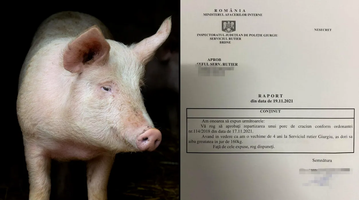 Un polițist din Giurgiu a întocmit un raport pentru a cere „repartizarea unui porc de 160 de kg”. Totul a fost o glumă a colegilor