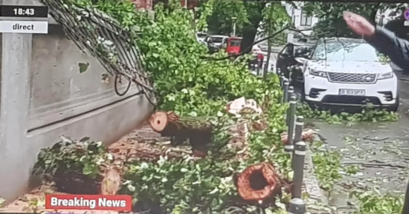 Un pom a căzut peste gardul sediului PNL din București, după furtuna care a devastat Capitala