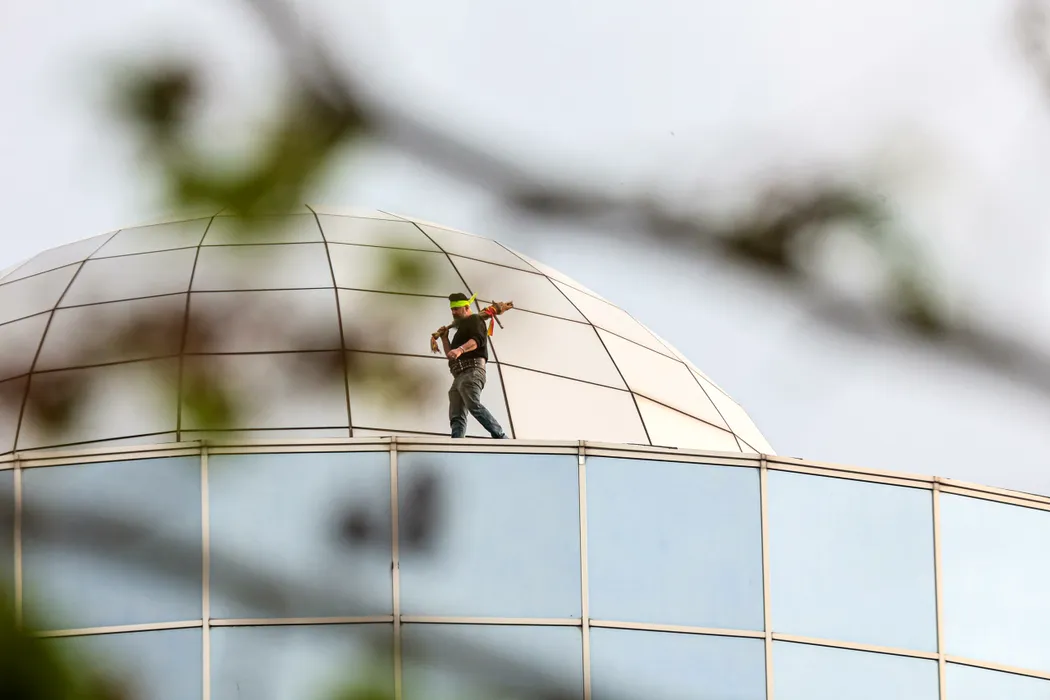 GALERIE FOTO: Un protestatar s-a URCAT pe sediul Înaltei Curți de Casație și Justiție, nemulțumit de decizia de a anula hotărârea Curții de Apel Ploiești