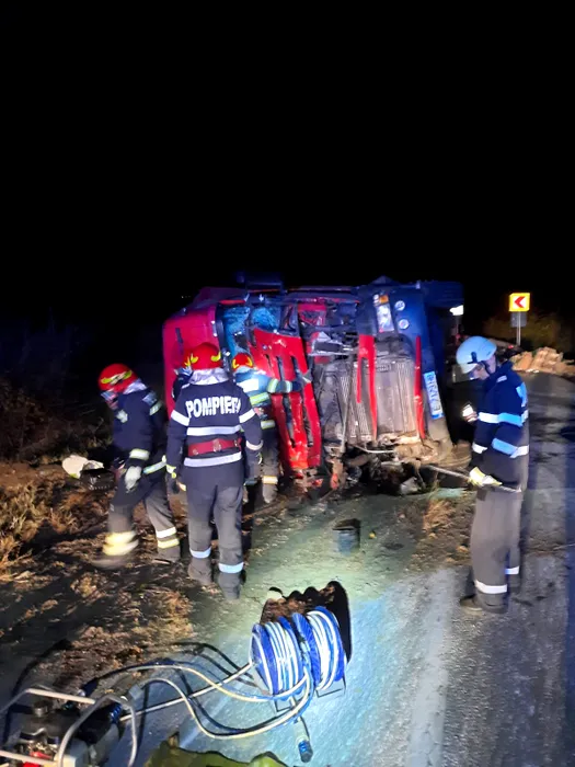 FOTO-VIDEO | Un șofer grec, în vârstă de 71 de ani, a murit pe un drum din Dolj după ce s-a răsturnat cu TIR-ul pe care îl conducea
