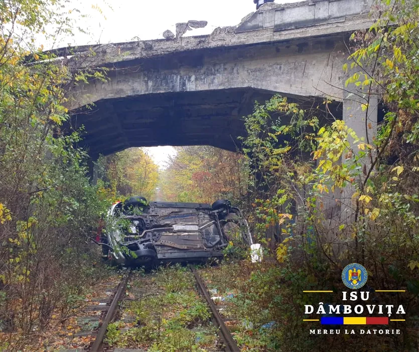 Un șofer în vârstă de 80 de ani a CĂZUT cu mașina de pe un pod și a ajuns pe calea ferată. Accidentul a avut loc în județul Dâmbovița