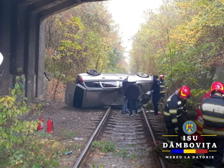 Un șofer în vârstă de 80 de ani a CĂZUT cu mașina de pe un pod și a ajuns pe calea ferată. Accidentul a avut loc în județul Dâmbovița