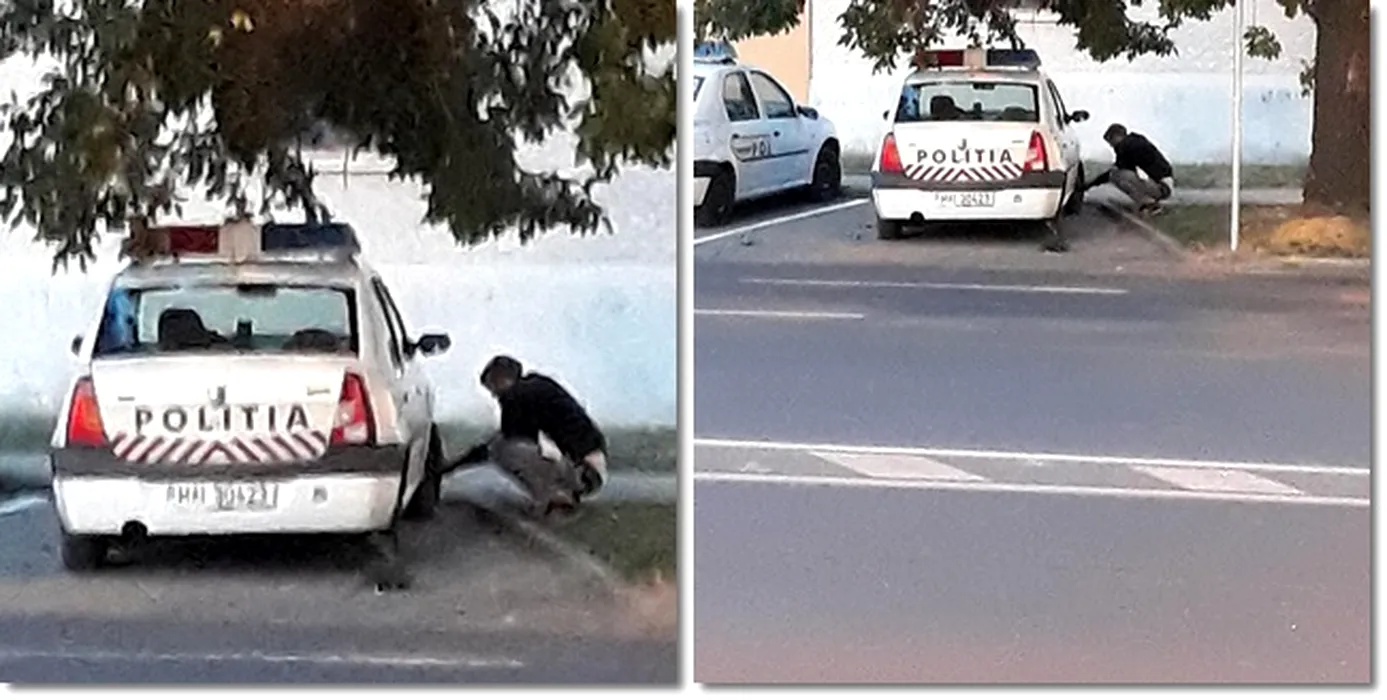 Un tânăr a fost fotografiat cum dezumflă roțile unei mașini de Poliție chiar în parcarea unei secții. Autorul nu a fost prins – FOTO