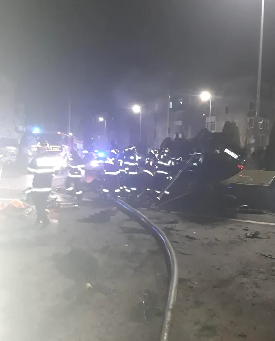FOTO-VIDEO | Un tânăr de 21 de ani a murit, după ce s-a răsturnat cu mașina într-un sens giratoriu din Sebeș. Accidentul, surprins de camerele de supraveghere