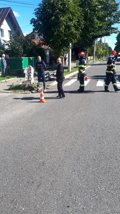 FOTO | Un tânăr de 22 de ani a murit după ce a intrat cu motocicleta într-o bornă kilometrică, pe un drum din Câmpina. Pasagerul său a fost rănit