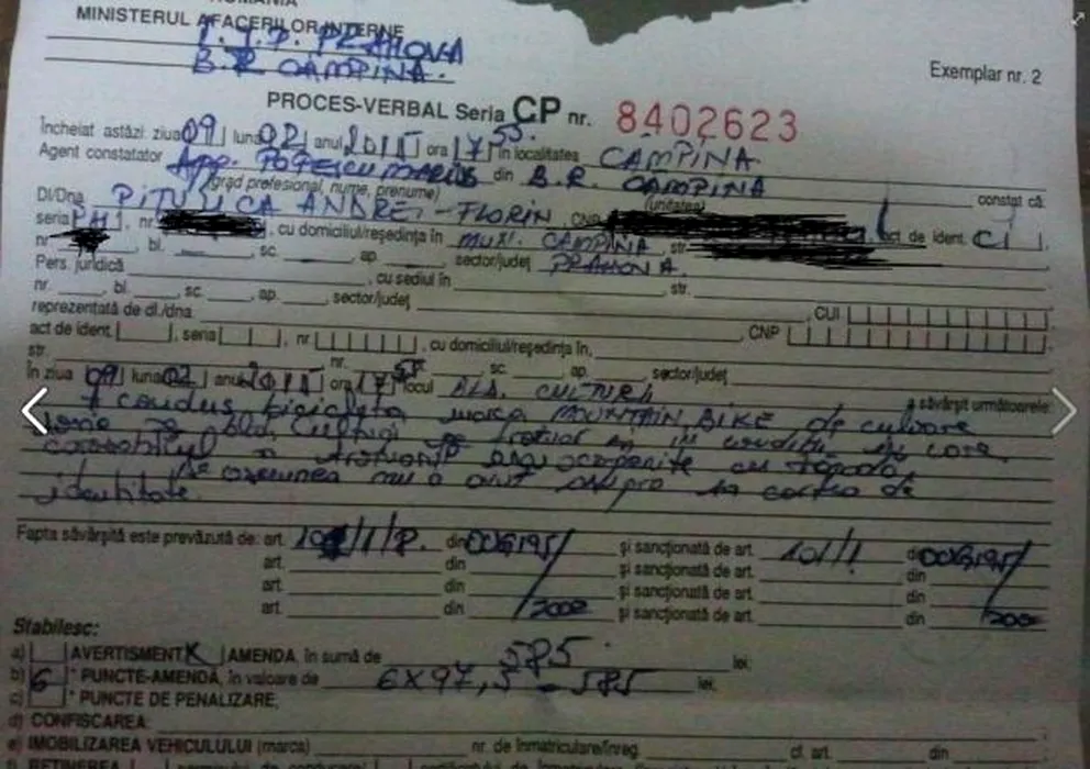 Un tânăr mergea cu bicicleta pe trotuar, când a fost oprit de polițiști. Ce au scris oamenii legii în procesul verbal
