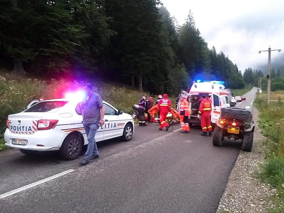 Un tânăr și iubita lui s-au răsturnat cu ATV-ul pe drumul spre cabana Gura Diham. Femeia a fost prinsă sub vehicul (FOTO)