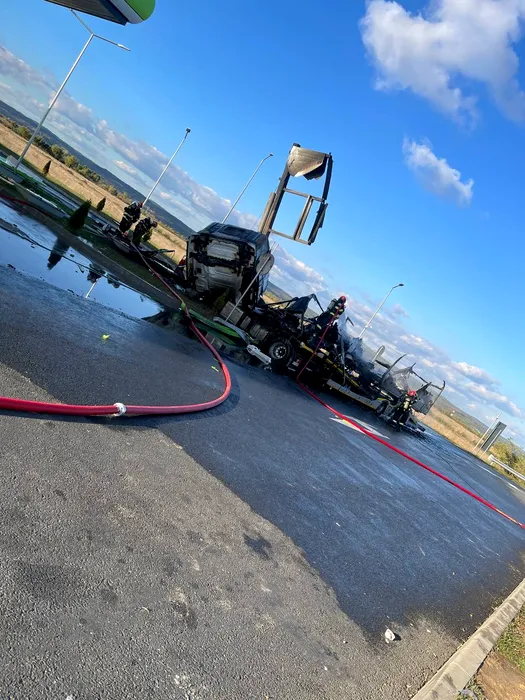 VIDEO | Un TIR care transporta rulote a luat foc după ce a lovit totemul unei benzinării, pe A1, în județul Timiș