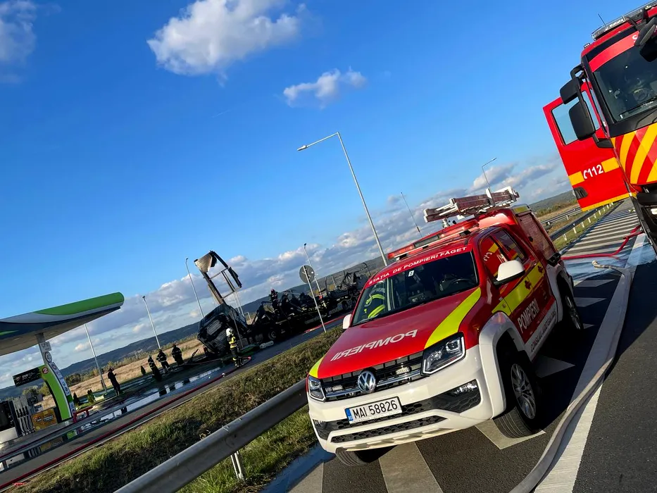 VIDEO | Un TIR care transporta rulote a luat foc după ce a lovit totemul unei benzinării, pe A1, în județul Timiș