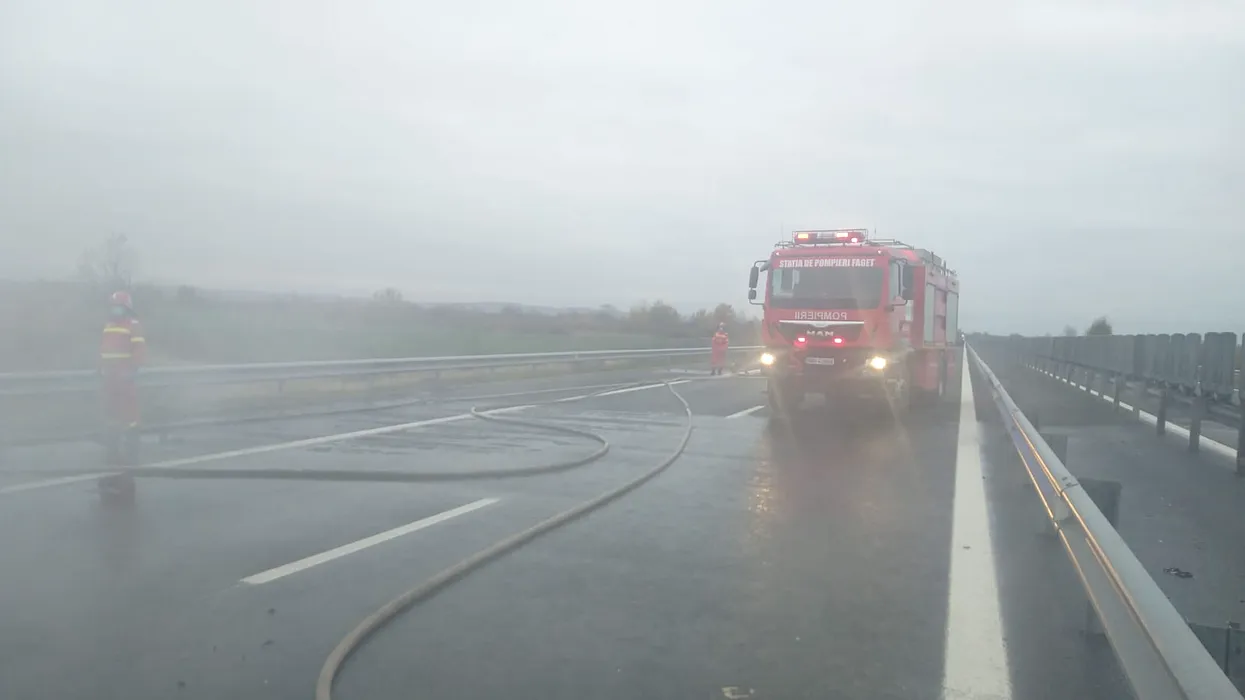 Un TIR încărcat cu opt autoturisme Dacia Duster a luat foc, pe A1 (VIDEO)