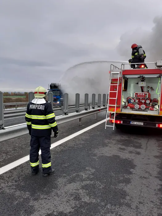 Un TIR încărcat cu opt autoturisme Dacia Duster a luat foc, pe A1 (VIDEO)