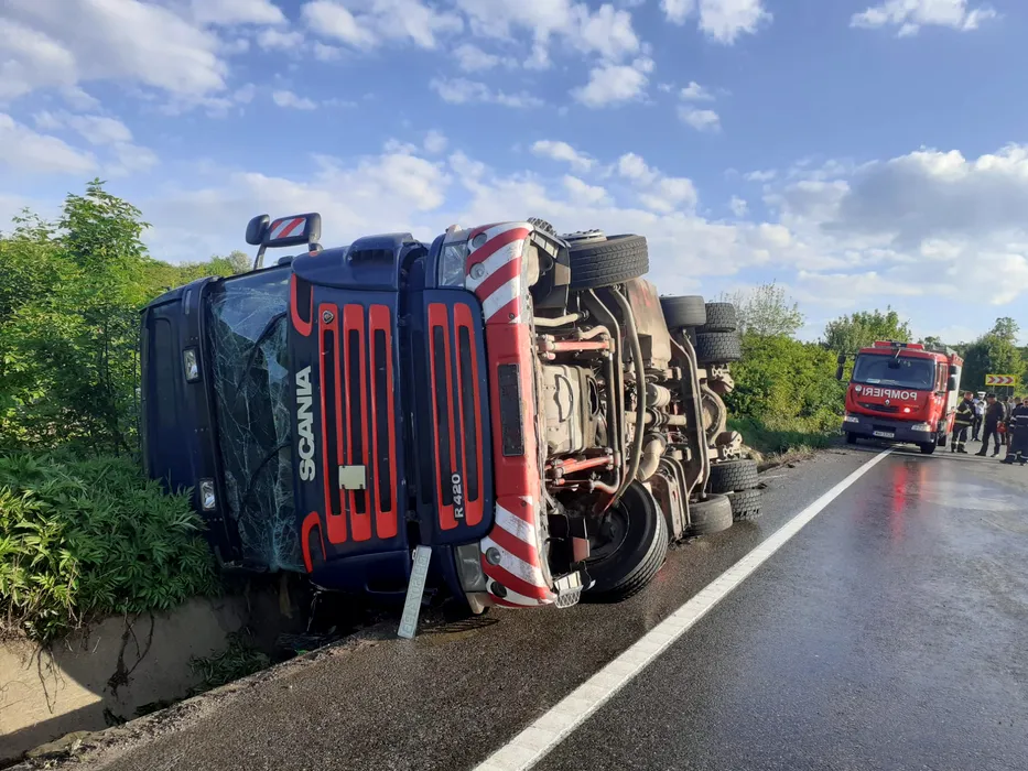 FOTO | Un TIR înmatriculat în Ucraina s-a răsturnat pe un drum din județul Vaslui. În ce stare este șoferul