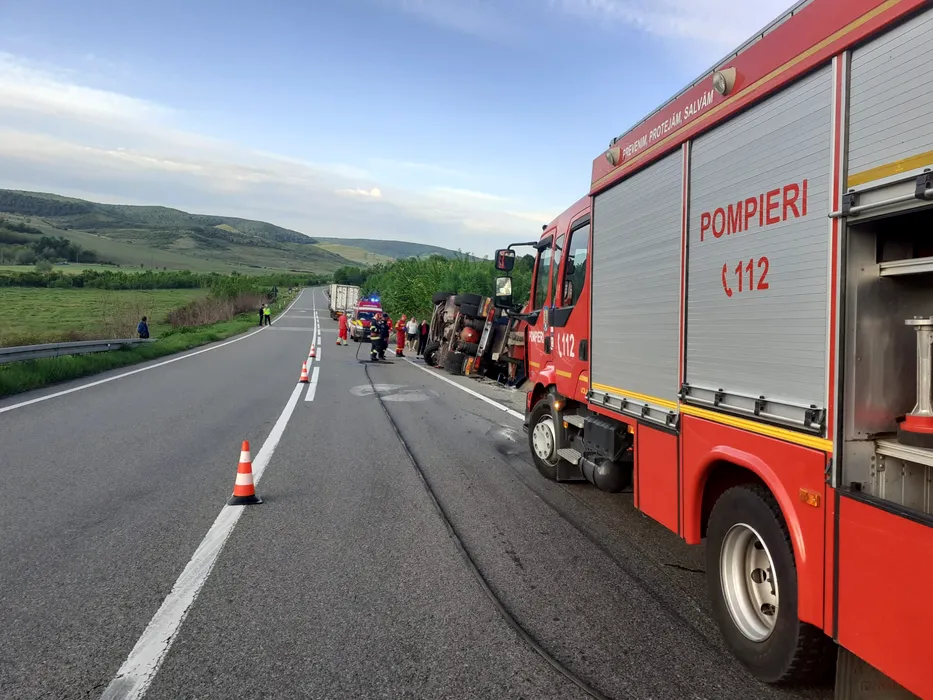 FOTO | Un TIR înmatriculat în Ucraina s-a răsturnat pe un drum din județul Vaslui. În ce stare este șoferul