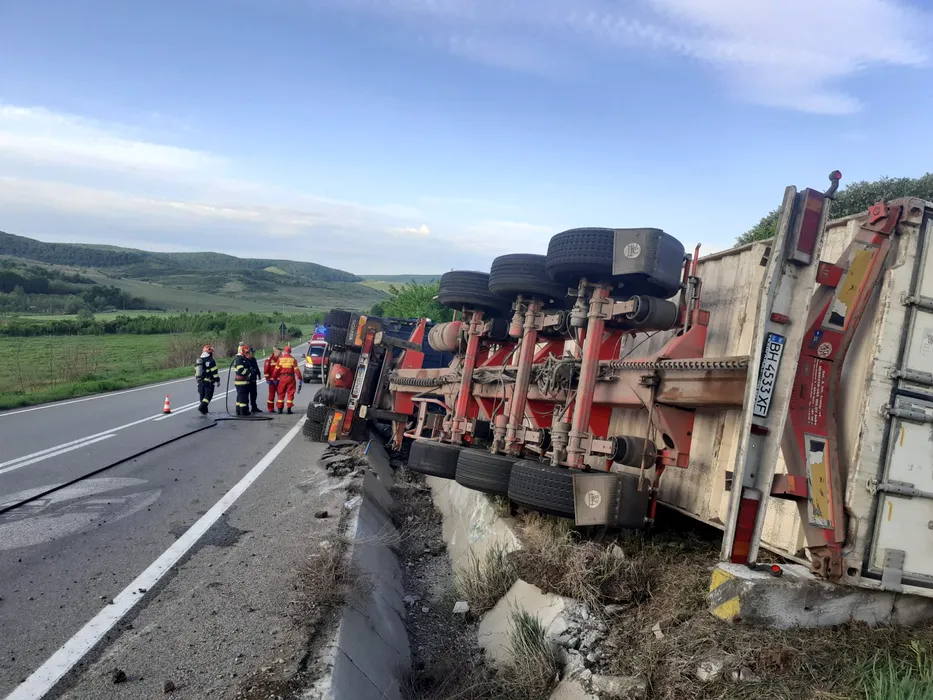 FOTO | Un TIR înmatriculat în Ucraina s-a răsturnat pe un drum din județul Vaslui. În ce stare este șoferul