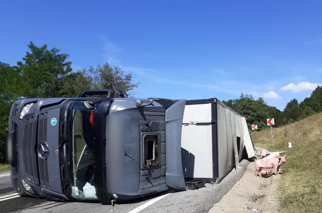 Un TIR plin cu 100 de porci vii s-a răsturnat pe un drum din județul Cluj. Pompierii au intervenit de urgență, pentru că din camion se scurgea carburant