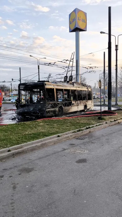 Un troleibuz a ars ca o torță în București. Imagini terifiante