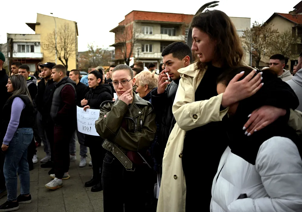 Protesters react during a demonstration in the town of Kocani on March 17, 2025, following a fire that tore through an overcrowded nightclub packed with mostly young people in North Macedonia, killing 59 revellers. A fire tore through an overcrowded nightclub packed with mostly young people in North Macedonia early on March 16, 2025, killing 59 people, apparently after on-stage fireworks at a hip-hop concert set the venue ablaze, authorities said. Some 155 people who were injured in the inferno had been taken to hospitals across the country, 22 of them in critical condition, officials said.,Image: 976648408, License: Rights-managed, Restrictions: , Model Release: no
