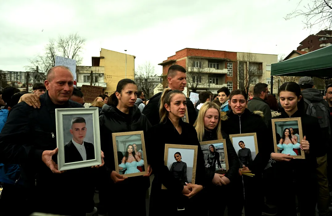 Demonstrators hold portraits of victims during a protest in Kocani on March 17, 2025, a day after a fire tore through an overcrowded nightclub packed with mostly young people in North Macedonia, killing 59 revellers. A fire tore through an overcrowded nightclub after on-stage fireworks at a hip-hop concert set the venue ablaze, authorities said. Some 155 people who were injured, 22 of them in critical condition, officials said. The club had reportedly breached several fire regulations, including having insufficient extinguishers and emergency exits. The club did not have a licence to use fireworks and did not have required safety vehicles parked outside.,Image: 976642731, License: Rights-managed, Restrictions: , Model Release: no