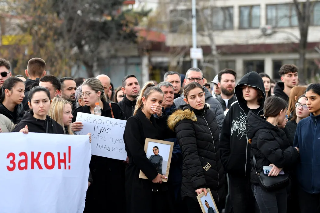 Protesters react as they demonstrate in the town of Kocani on March 17, 2025, a day after a fire tore through an overcrowded nightclub packed with mostly young people in North Macedonia, killing 59 revellers. A fire tore through an overcrowded nightclub packed with mostly young people in North Macedonia early on March 16, 2025, killing 59 people, apparently after on-stage fireworks at a hip-hop concert set the venue ablaze, authorities said. Some 155 people who were injured in the inferno had been taken to hospitals across the country, 22 of them in critical condition, officials said.,Image: 976647258, License: Rights-managed, Restrictions: , Model Release: no