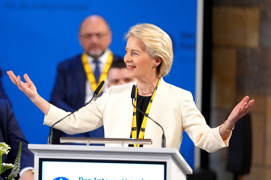 Ursula von der Leyen, în timpul discursului său de acceptare la ceremonia de decernare a Premiului Internațional Charlemagne 2025 de la Primăria din Aachen.
